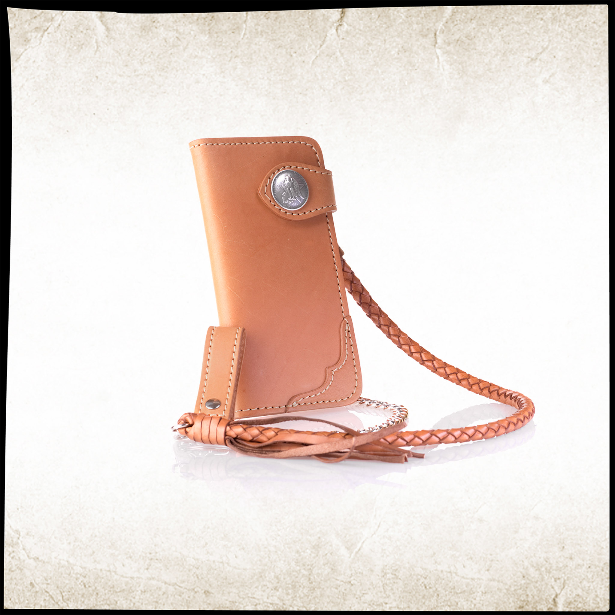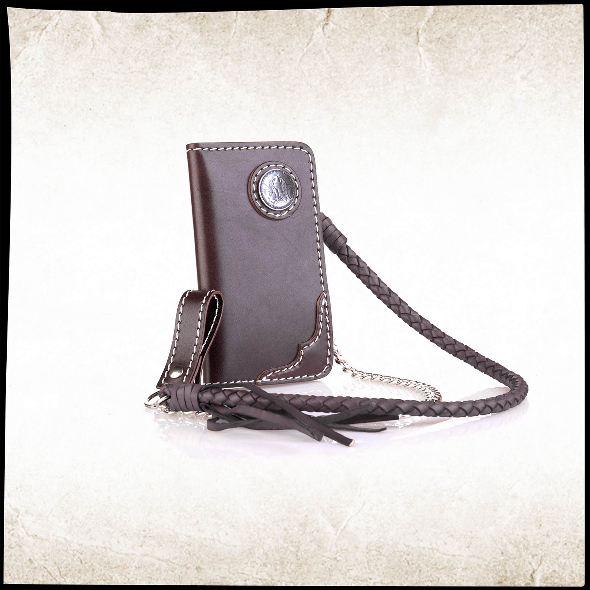 Possibilità di avere solo il portafoglio, oppure corredato come da foto, con laccio intrecciato, catena e passante per cintura. Disponibile nei colori: tyesta di Moro,…