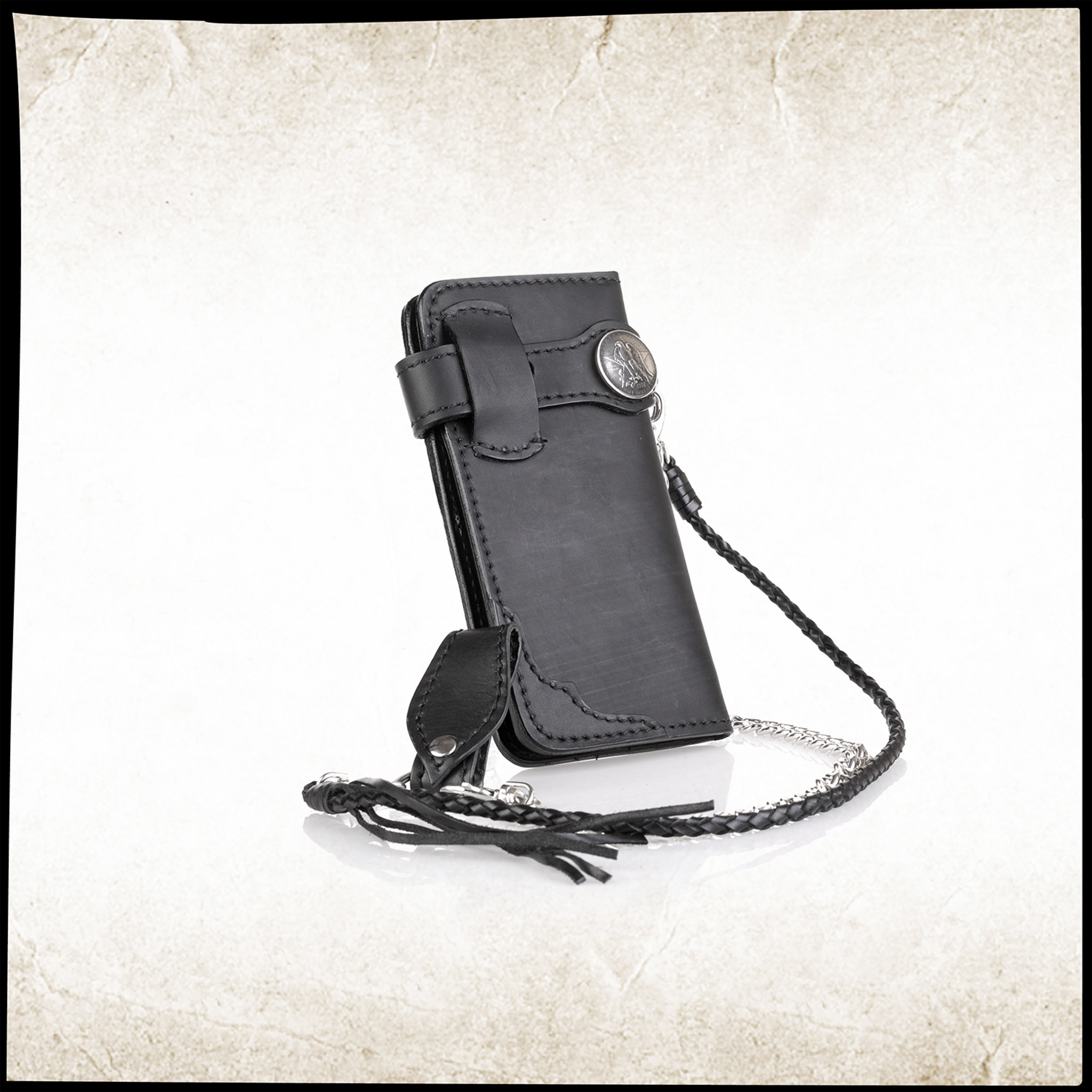 Possibilità di avere solo il portafoglio, oppure corredato come da foto, con laccio intrecciato, catena e passante per cintura. Disponibile nei colori: testa di Moro,…