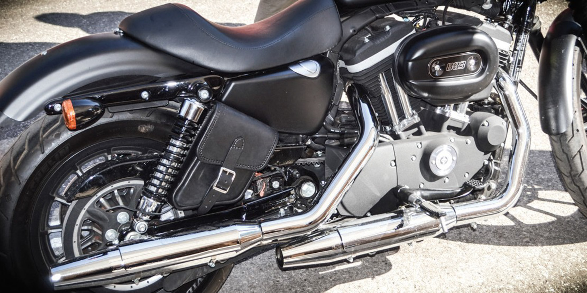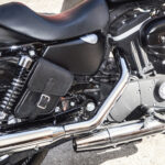 La borsa è studiata appositamente per essere fissata davanti all’ammortizzatore degli Sportster tramite delle cinghiette con fibbia: questa versione può essere montata sugli Sportster senza togliere, laddove è presente, la pedivella del passeggero.