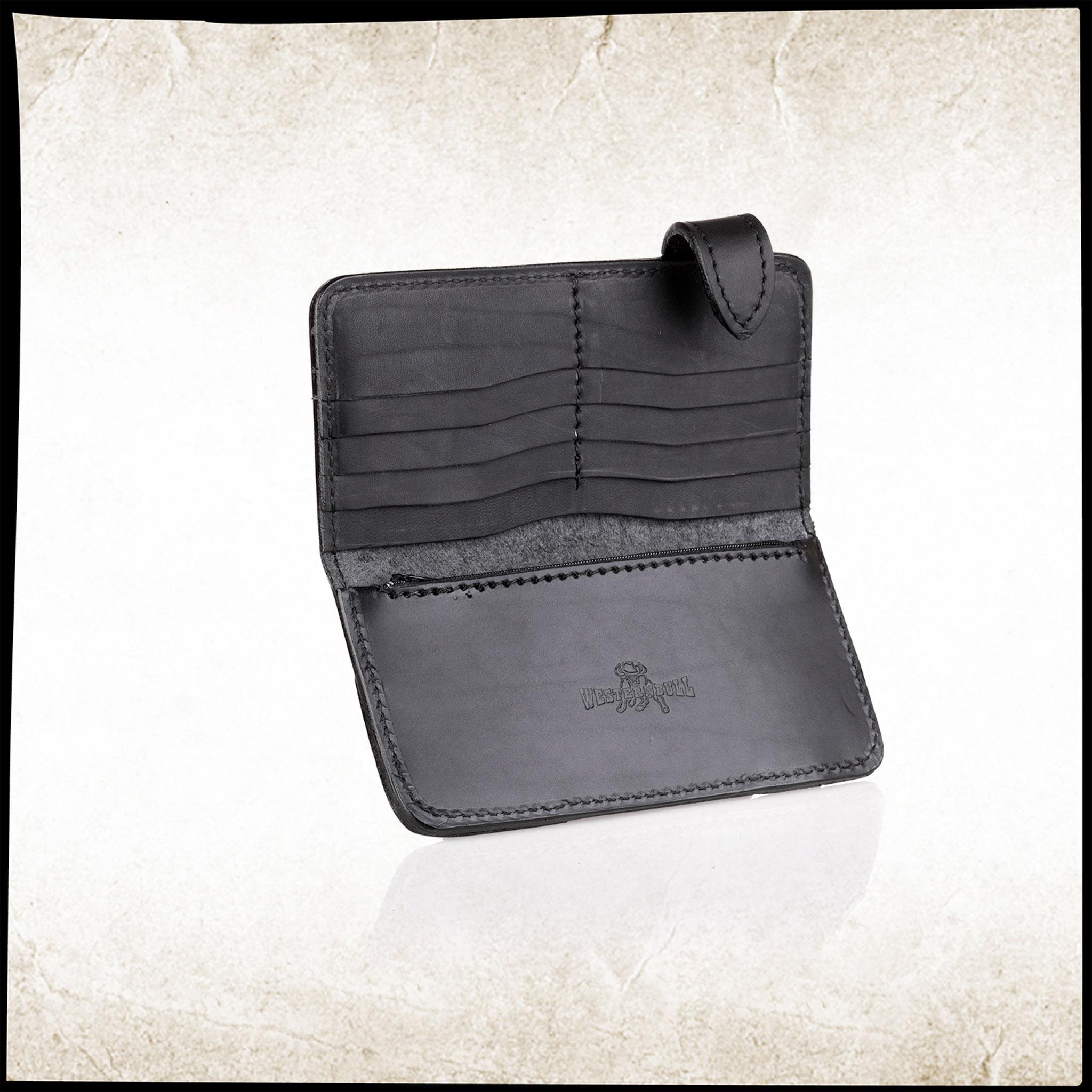 Possibilità di avere solo il portafoglio, oppure corredato come da foto, con laccio intrecciato, catena e passante per cintura.